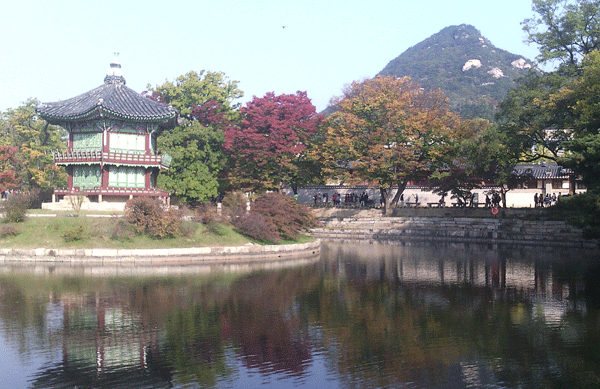 此次韓國之旅的第一站是景福宮,走在遍布漢字的古代宮廷,聽著腳踩沙子的聲音,真有點(diǎn)分不清是在異域,還是在祖國。離開景福宮,驅(qū)車前往戰(zhàn)爭紀(jì)念廣場。雖是深秋,但當(dāng)客車行駛在被綠蔭環(huán)抱的道路時(shí),那沁人心脾的綠,還是讓人心醉。在戰(zhàn)爭紀(jì)念廣場,一側(cè)是嬉戲的孩童、飛翔的和平鴿,一側(cè)是朝鮮戰(zhàn)爭期間使用過的各種武器,這一切給人帶來的心靈震顫與情感沖擊是那樣的強(qiáng)烈。